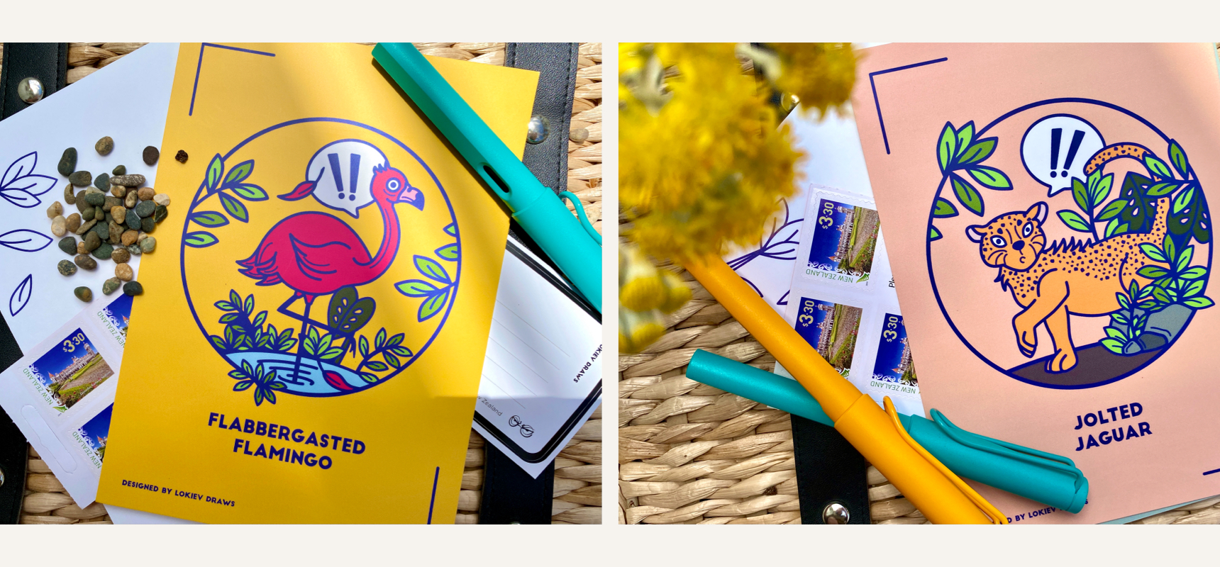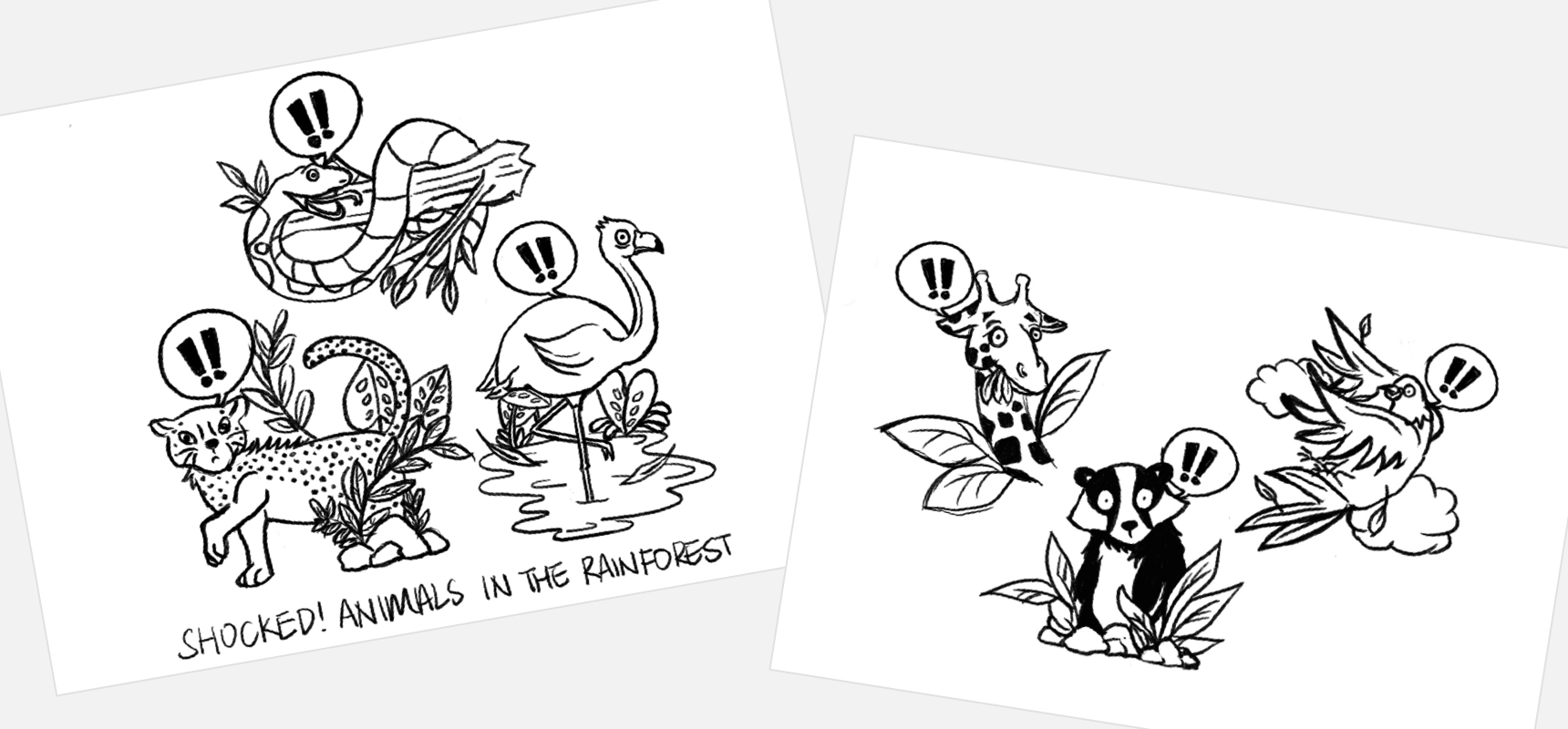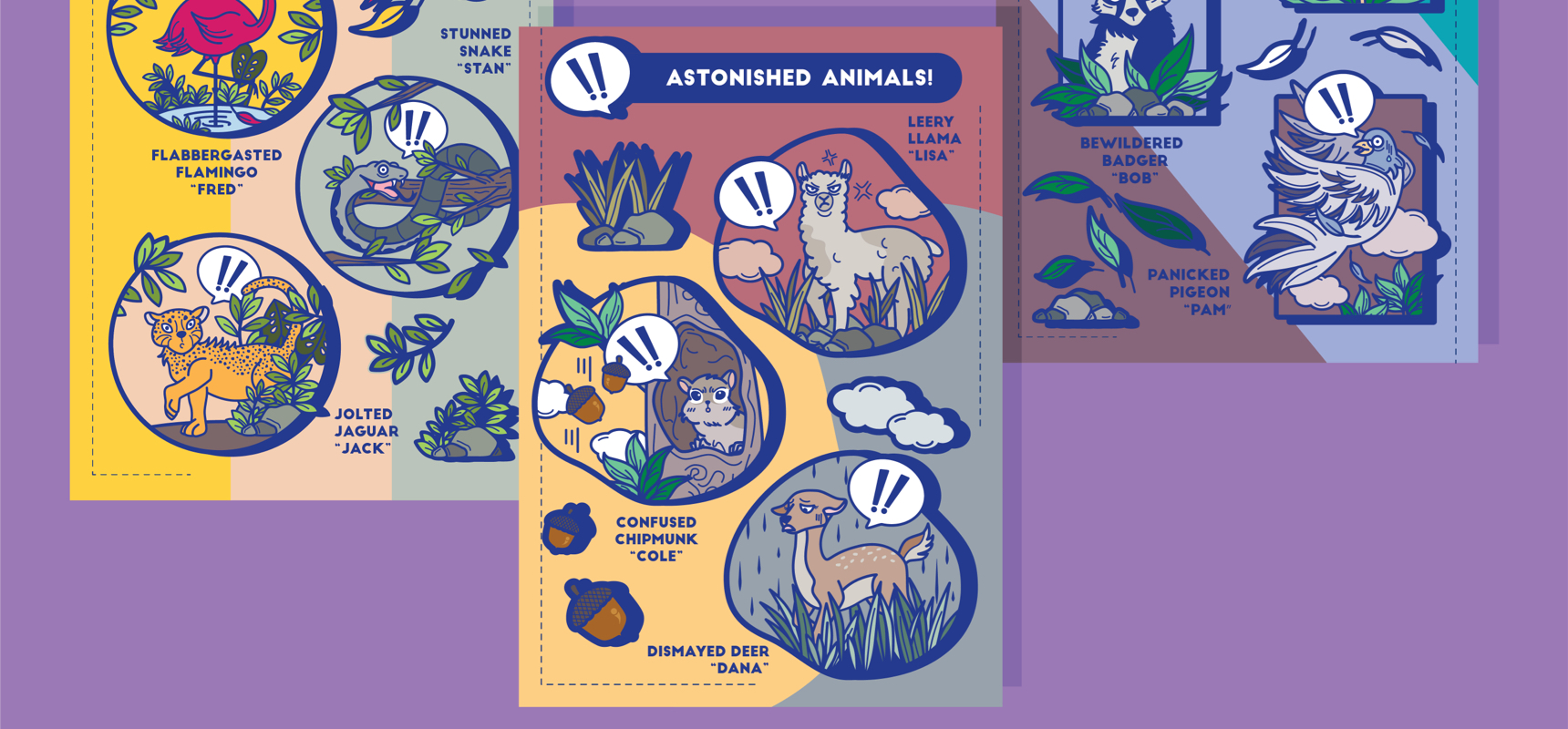 I've always preferred doing animal and creature illustrations, and an idea came to mind of doing a set of alliterative designs for animals. I also really enjoy and am amused by wide-eyed shocked looks, and decided to go for an "astonished animals" concept.