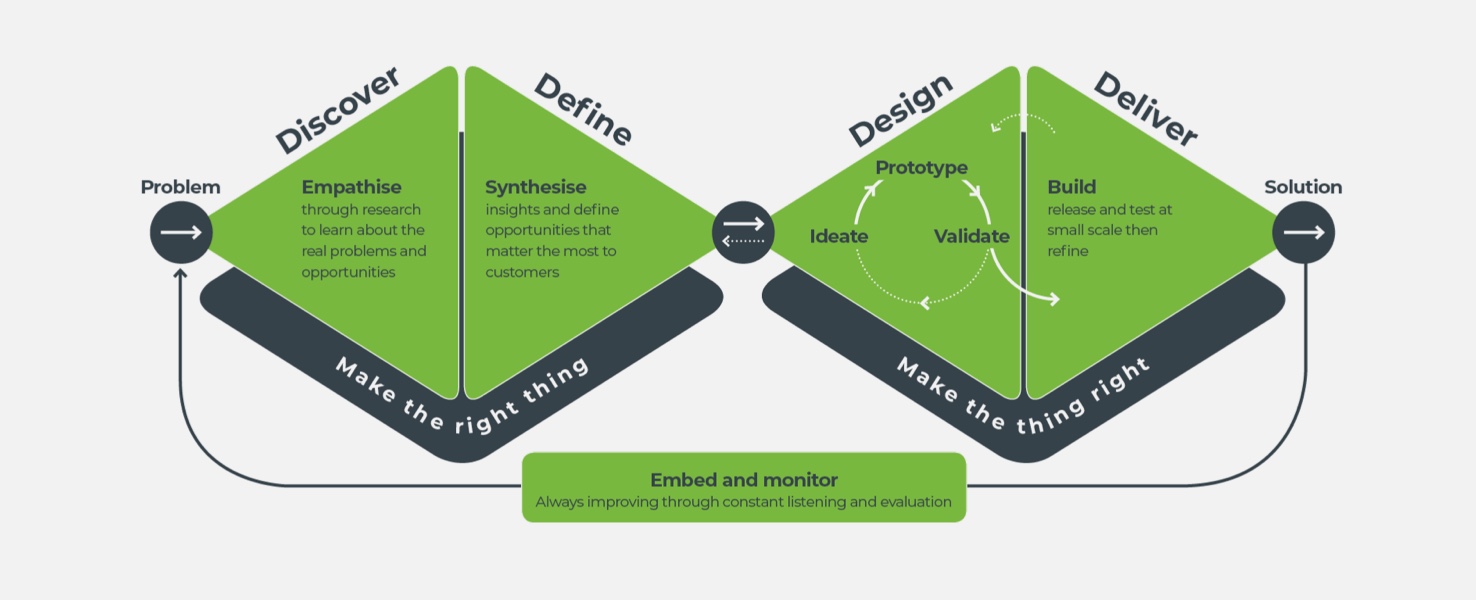 As a foundation for all the projects that I look at, I use the Double Diamond design process. While this is not a linear process, and not all projects will have to go through all four stages, it serves as a good guide as to how to tackle a project holistically to make sure that we are doing things right, and for the right reasons.